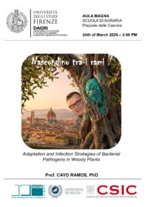 Titled “Nascondino tra i rami”, the seminar focuses on the adaptation and infection strategies of bacterial pathogens in woody plants. The presentation examines how bacterial pathogens establish themselves within tree tissues, the biological mechanisms that underpin their survival and spread, and the defensive responses developed by woody hosts. Bringing together perspectives from microbial ecology, plant physiology, and molecular plant–microbe interactions, the seminar provides a comprehensive overview of the processes shaping these intricate biological relationships, with relevance for plant health, forestry, and sustainable agriculture.
