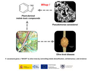 Investigadores del IHSM La Mayora (UMA–CSIC) han identificado WHOP, una región exclusiva de patógenos de leñosas que aumenta la virulencia de Pseudomonas savastanoi en olivo al modular el metabolismo indólico/IAA. Han mostrado que WhpR regula este sistema y favorece la colonización, abriendo nuevas estrategias de control de la enfermedad.