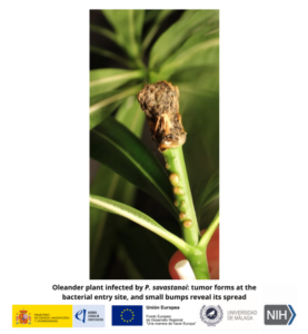 Investigadores del IHSM La Mayora (UMA–CSIC), en colaboración con UC Davis, han identificado que Pseudomonas savastanoi utiliza el efector HopBL2 —exclusivo de cepas adaptadas a plantas leñosas— como pieza clave para causar enfermedad. Han demostrado que HopBL2 es esencial para la virulencia y que, dentro de la célula vegetal, se acumula en focos subnucleares y se asocia a los plasmodesmos (y parcialmente a microtúbulos), lo que apunta a una estrategia para manipular la comunicación célula-a-célula y favorecer la colonización.